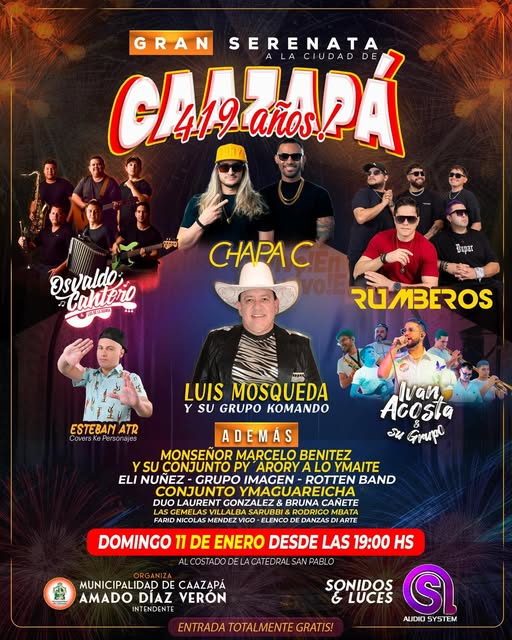 CAAZAPÁ. Este domingo 11 de enero, desde las 19:00 horas, la ciudad de Caazapá se vestirá de fiesta para conmemorar sus 419 años de fundación con una gran serenata musical al costado de la Catedral San Pablo. El evento, organizado por la Municipalidad local bajo la gestión del intendente Amado Díaz Verón, reunirá a destacados artistas nacionales y locales en una noche de música, cultura y tradición.