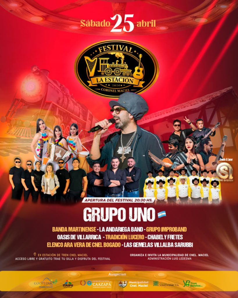 Según el programa, el festival arrancará a partir de las 20:30 horas y contará con la participación estelar del Grupo Uno de Argentina, además de una destacada grilla artística que incluye a Banda Martinense, La Andariega Band, Grupo Improbando, Oasis de Villarrica, Tradición Lucero, Chabel y Fretes, el elenco Ara Vera de Coronel Bogado y Las Gemelas Villalba Sarubbi, entre otros.
