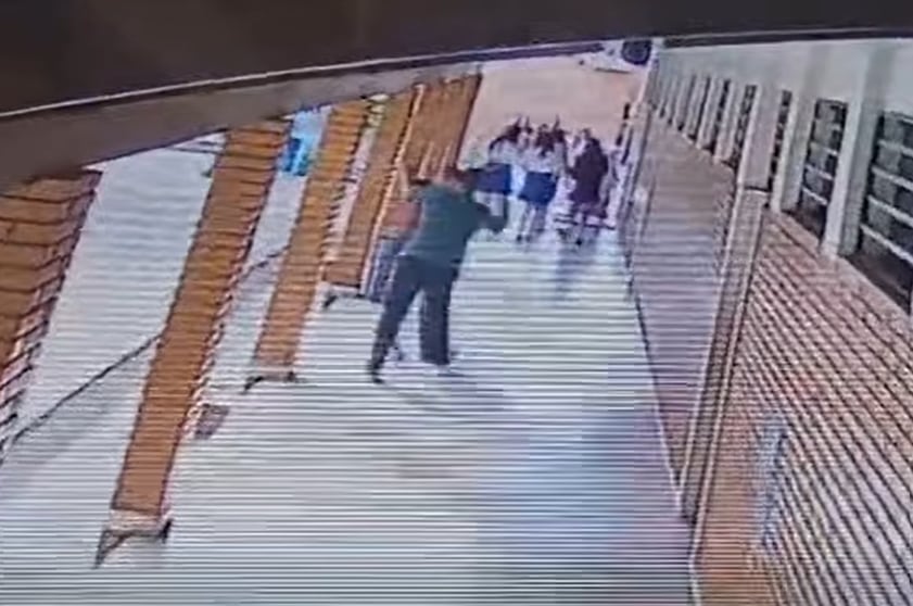 Imágenes de circuito cerrado muestran el momento en que este hombre empuja al educador, contra quien profirió todo tipo de insultos y amenazas, según la denuncia. Posteriormente, le propinó golpes de puño en el rostro y la cabeza.